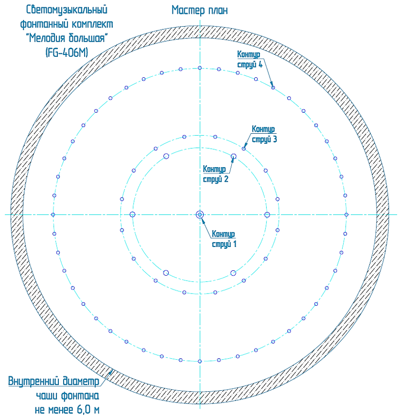 1. Внутренний ø чаши фонтана (чаша в комплект не входит) не менее — 6,0 м.2. Глубина воды в фонтане — от 500 до 550 мм.