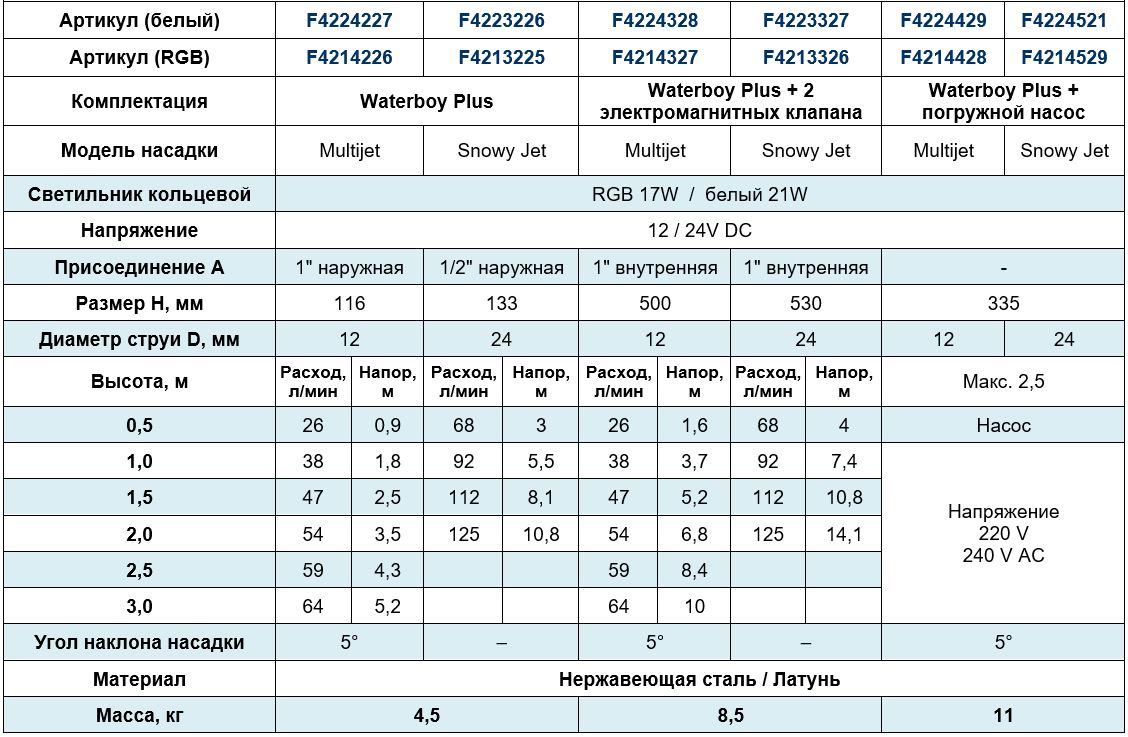 Пешеходный фонтанный модуль Waterboy Plus изготовлен из нержавеющей стали и специально спроектирован для установки в плоскостных («сухих») фонтанах. Он включает управляемую систему подсветки, благодаря которой водная картина становится интереснее и привлекает больше внимания. Система характеризуется простотой установки и обслуживании.